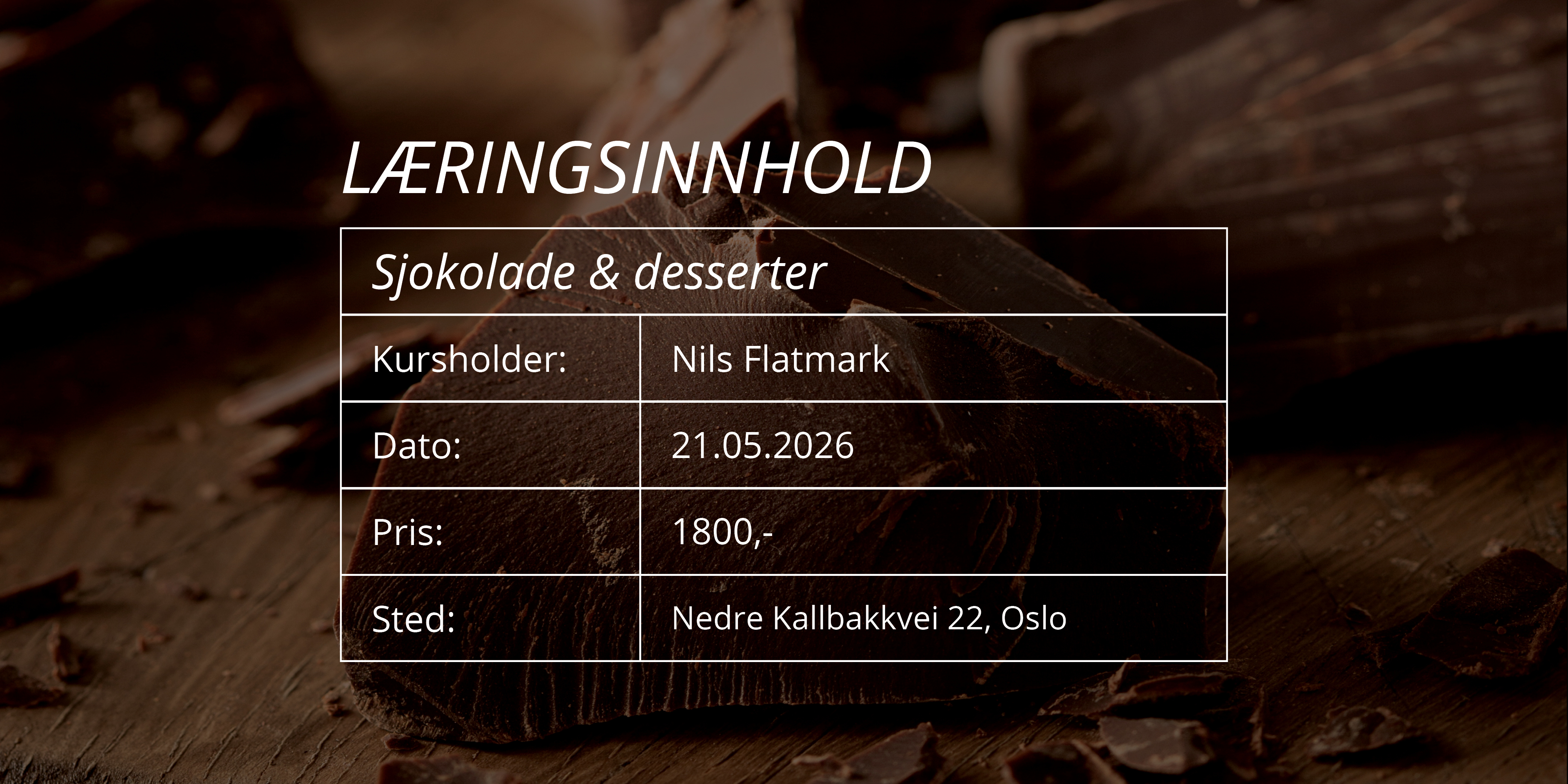 Sjokolade & Desserter med Nils Flatmark Kursholder: Nils Flatmark Dato: 21.05.2026 Pris: 1800,- Sted: KIT-akademiet ASKO NORGE (Nedre Kalbakkvei 22, Oslo) Les mer Meld deg på
