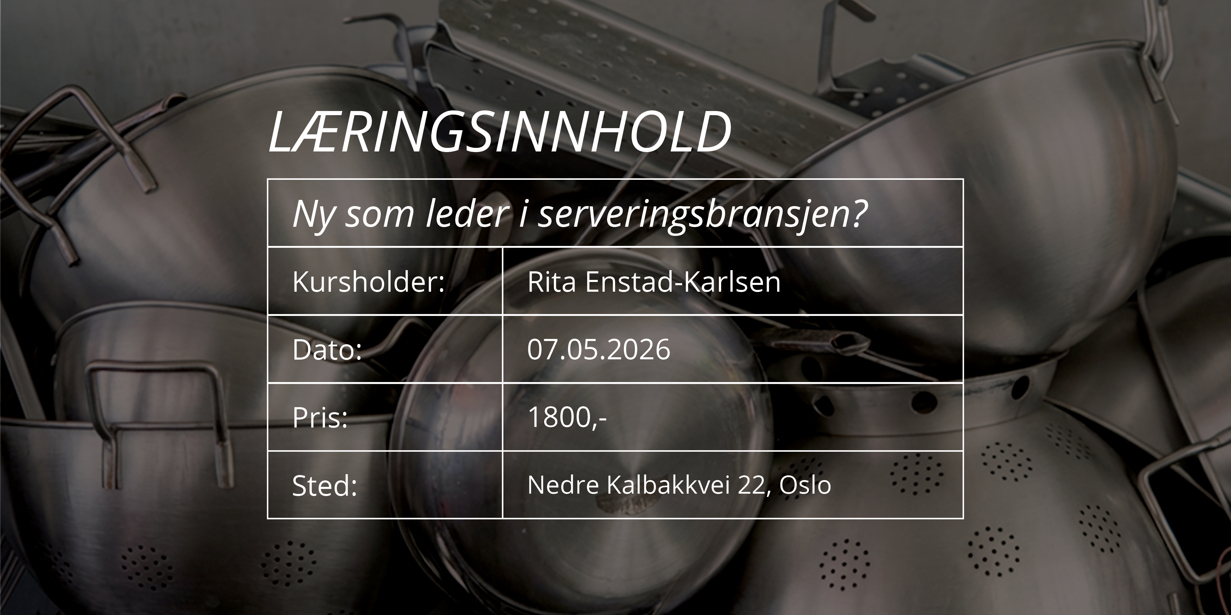 Ny som leder i serveringsbransjen? Få en trygg start! Kursholder: Rita Enstad-Karlsen Dato: 07.05.2026 Pris: 1800,- Sted: KIT-akademiet ASKO NORGE (Nedre Kalbakkvei 22, Oslo) Les mer Meld deg på