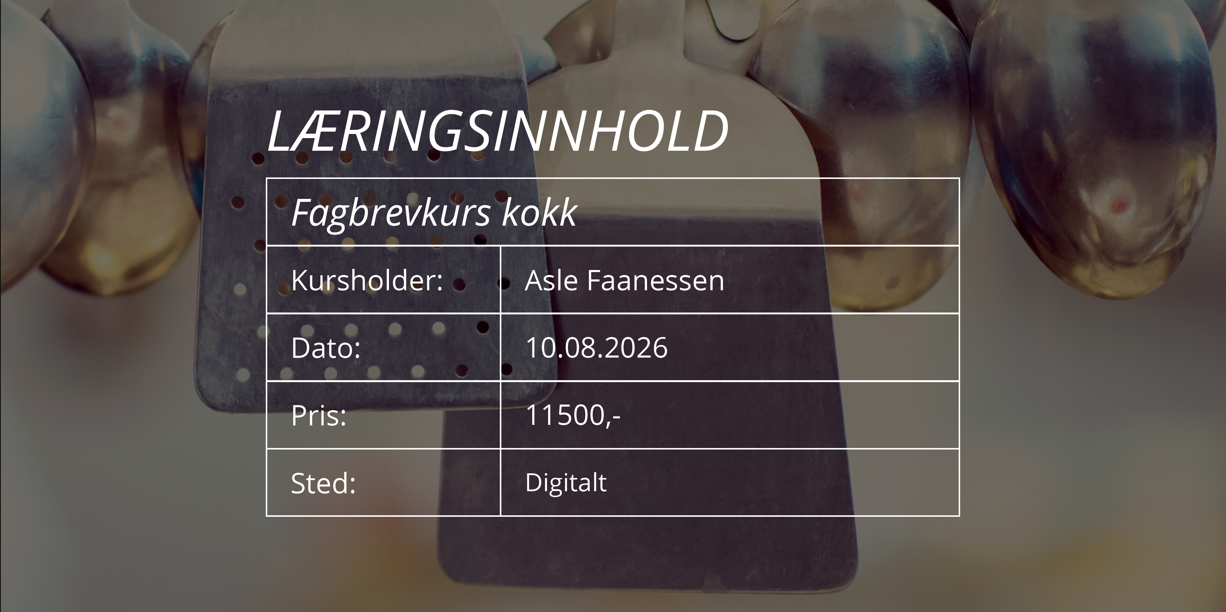 FAGBREVKURS KOKK - DIGITALT KURS Kursholder: Asle Faanessen Dato: 10.08.2026 Pris: 11500,- Sted: Digitalt Les mer Meld deg på